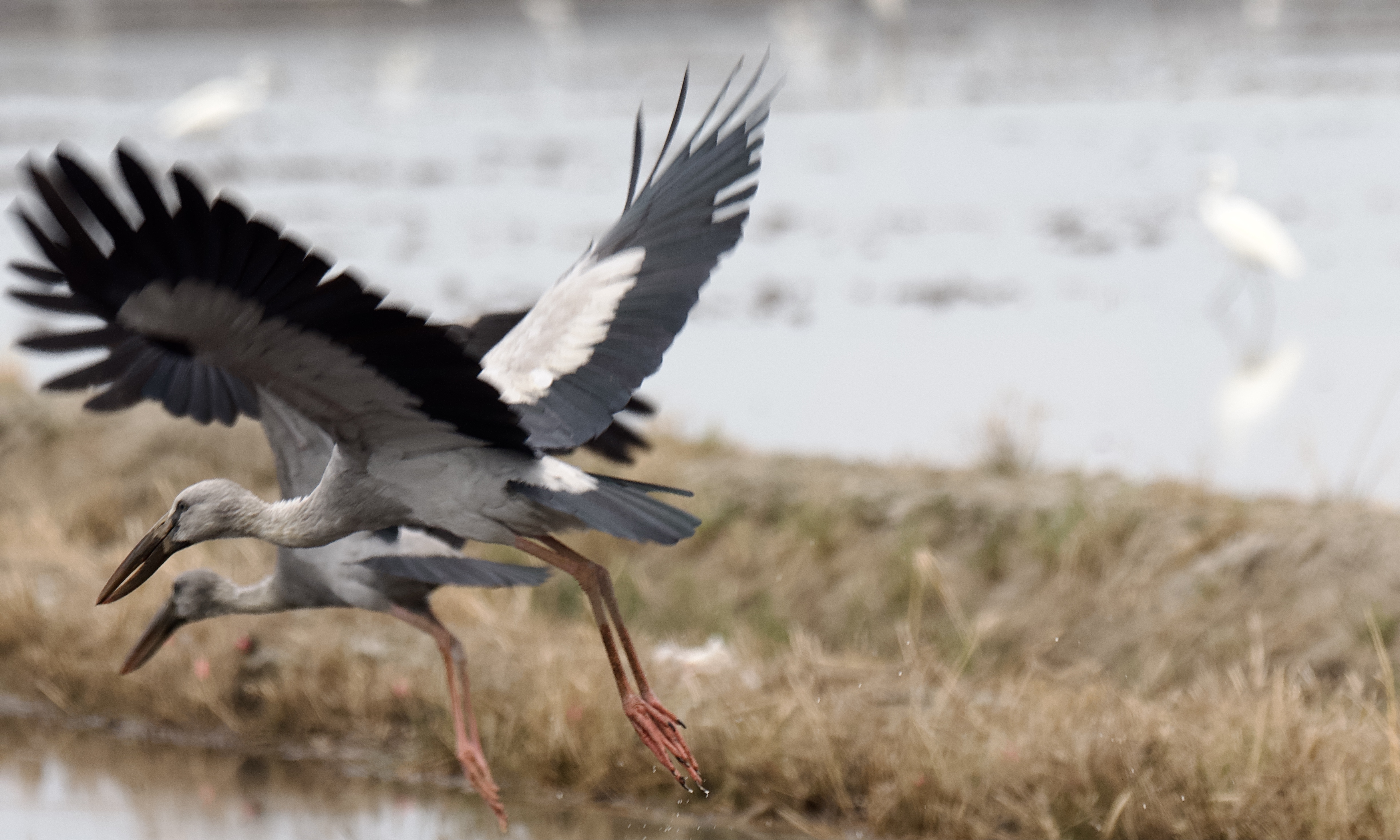 A relatively small stork species with a grayish to white body and black wings and tail with a hint of gloss. The Asian Openbill gets its name from a distinctive gap in the dull grayish yellow bill. Note the pinkish legs. Asian Openbills inhabit wetland habitats including shallow marshes, flooded agricultural fields, and lakes. From a distance they could be confused with herons, but they can be clearly distinguished from herons by their feeding habits—wading slowly through shallow water. Soars frequently, often in large dense flocks; note extended neck, unlike retracted neck of herons and egrets.